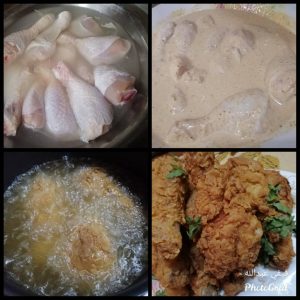 – نحضر صحن ونضع فيه الدقيق، النشا، والبهارات كلها ماعدا الكركم مع ماء. تخلط جيداً ننشل الدجاج من الماء ويوضع في الخليط لساعات.