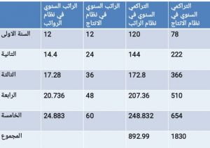 فلنأخذ نموذج مقارنة بسيطة بين نظام الراتب وبين نظام الإنتاج، في حالة فرضنا ثبات القيمتين لمدة خمسة سنوات فلنبدأ بقيمة ابتدائية في نظام ١٠٠٠ جنيه تزيد شهريا، بنفس الرقم.