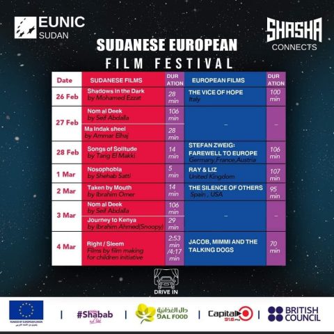والذي بدأت فعالياته يوم أمس الجمعة ٢٦ فبراير والذي يمتد حتى أولى أيام شهر مارس، وذلك بمعرض الخرطوم الدولي، المهرجان سيعرض أفلام لمخرجين سودانيين وأوربيين مميزين وواعدين جدا، نذكر منهم على سبيل المثال، إبراهيم سنوبي وشهاب ساتي وغيرهم من المميزين، وستشمل الأفلام القصيرة والطويلة والروائية والوثائقية.