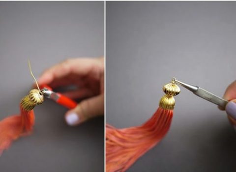 3 _بواسطة الكماشة قومي بتثبيت خطاف الأذن في الخيوط و تأكدي من ثباتها جيدا.