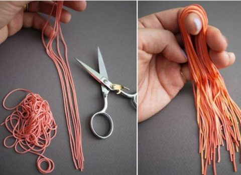 1 _قومي بقص الخيط متساوي الطول الذي تريدينه ثم امسكي الخيوط معا لتكون منقسمة إلى نصفين متساويين , كما موضح في الصورة .