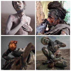 ونجدهم يؤدون العديد من الطقوس الغريبة كمسح الجسد برماد الموتى، التجول بدون ملابس في الشوارع وأكل لحوم البشر وفضلاتهم لتعزيز الروابط الروحية مع الإله .الأكل والشرب في جماجم بشرية حقيقية، و تدخين الماريجوانا والحشيش بإستمرار كل يوم، والعيش في عزلة وقطع كل الروابط الأسرية والتركيز فقط على الصلاة وممارسة التأمل في مقاطعة أوتار براديش شمال الهند .