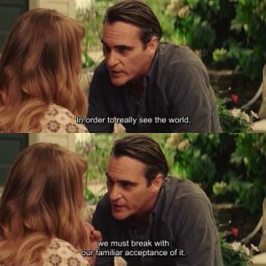 يرى أنه من الممل عدم وجود معنى لوجودنا اليومي في الحياة .. مستاء من الواقع و يصفه بأنه مقرف ، لما فيه من الجشع و الكذب و القتل و انعدام الأخلاق ، يحاول أثناء محاضراته أن يسخر من الفلسفه نفسها لأن ما بالكتب يختلف عن الواقع، و يذكر مراراً عالم الفلسفه ( كانط) و عالمه الأخلاقي الذي لا مكان للكذب فيه و أن أصغر كذبة تهدمه بالكامل .